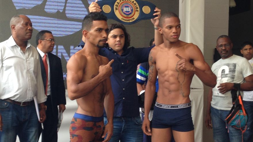 Ambos púgiles marcaron 129 libras y media. Peso ideal para la pelea de las 130 Lbs. que se dará a 9 asaltos este próximo martes desde el hotel Riu Plaza.