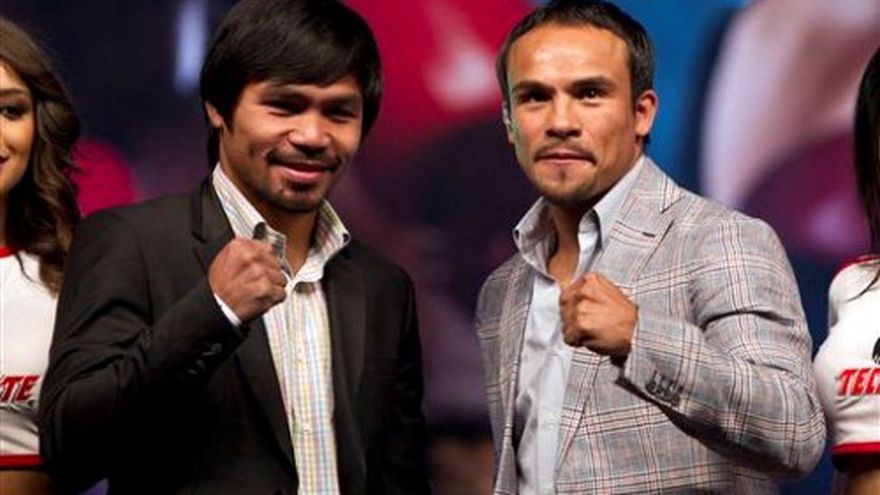 El campeón filipino Manny Pacquiao le cedió a su rival mexicano Juan Manuel Márquez el protagonismo al visitar hoy México con fines de promoción de su cuarta pelea del próximo 8 de diciembre en Las Vegas, Estados Unidos. Los púgiles se vieron las caras de forma amenazante y se mostraron el puño en la última de una gira de promoción de la pelea que los llevó a presentarse en las ciudades estadounidenses de Los Ángeles y Nueva York. "Estoy contento de enfrentarlo por cuarta ocasión, tengo que reconocer lo difícil que es como boxeador, un gran guerrero, y la verdad estoy contento de venir a la Ciudad de México", dijo Pacquiao en una presentación que reunió a unos 8.000 aficionados. Estos fanáticos, que llegaron varias horas antes a la Arena Ciudad de México para verlos cara a cara, le silbaron al campeón filipino tanto como celebraron al campeón mexicano, aunque unas decenas de filipinos en las gradas agitaron banderas de su país. "A los filipinos en méxico, muchas gracias por estar aquí. No era mi intención pelear contra otro boxeador mexicano, pero así son las cosas", señaló Pacquiao, quien observó en todo momento el romance de Márquez con su público. El campeón mexicano disfrutó de su día y afirmó que hará una buena preparación para enfrentar su cuarta pelea contra Pacquiao tras sostener que se siente ganador de los combates previos ya que le robaron el triunfo. "Me voy a preparar muy bien, este es un nuevo reto para mí, voy a llegar muy bien preparado, un reto fuerte y difícil, pero vamos a festejar Navidad y Año Nuevo", declaró Márquez al dirigirse a la multitud. La presentación de la cuarta edición de Pacquiao-Márquez en México fue una gran oportunidad para cientos de vendedores que se instalaron en las calles cercanas para ofrecer desde camisetas con fotografías de los peleadores y tazas para café.
