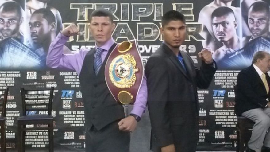 El campeón mundial superpluma de la Organización Mundial de Boxeo (OMB), el puertorriqueño Román "Rocky" Martínez, se enfrentará al ex campeón mundial invicto estadounidense Miguel Ángel "Mikey" García, intentando defender por tercera ocasión su corona, el extriple campeón mundial filipino Nonito "Filipino Flash" Donaire, le dará la revancha al dos veces campeón del mundo armenio Vic "Raging Bull" Darchinyan, y el invicto armenio nacionalizado estadounidense Vanes "Nightmare" Martirosyan se medirá al imbatido estadounidense Demetrius "Boo Boo" Andrade en disputa del título mundial superwelter OMB, que se encuentra vacante, en los combates triple estelares de la velada que se desarrollará en la noche del sábado en el American Bank Center de Corpus Christi, Texas, Estados Unidos. Un tercer combate de campeonato mundial que se disputará en la misma noche, que será el duelo entre el campeón mundial pluma de la Asociación Mundial de Boxeo (AMB), el invicto jamaiquino Nicholas "Axe Man" Walters, quien se medirá al mexicano Alberto "Kichis" Garza, intentado defender por primera ocasión su corona, además de la actuación del cotizado prospecto mexicano Oscar Valdez. En el combate principal de la velada, el campeón mundial superpluma de la Organización Mundial de Boxeo (OMB), "Rocky" Martínez (27-1-2, 16 KOs), se enfrentará al ex monarca pluma de la OMB, "Mikey" García (32-0, 27 KOs), intentando defender por tercera ocasión su corona. En la tarde del viernes, ambos superaron la ceremonia de pesaje, dejando todo listo para su esperado duelo titular. Martínez registró 129.75 lbs. En tanto García marcó 128.75 lbs. RESULTADOS DEL PESAJE Román Martínez 129.75 lbs. vs. Miguel Ángel García 128.75 lbs. Título mundial superpluma OMB Nonito Donaire 125.25 lbs. vs. Vic Darchinyan 125.75 lbs. Vanes Martirosyan 153.75 vs. Demetrius Andrade 153.75 Título mundial superwelter OMB Nicholas Walters 125 lbs. vs. Alberto Garza 125.5 lbs. Título mundial pluma AMB Oscar Valdez 127.75 lbs. vs. Jesús Lule 127.75 lbs. Alex Saucedo 145.25 lbs. vs. Steve Hall 146 lbs. lbs. Erick De León 129.75 lbs. vs. Jesús Aguinaga 130.25 lbs. Oscar Cantú 117.5 lbs. vs. Roberto Cerón 118.25 lbs. TEXTO: notifight.com FOTO: wboboxing.com