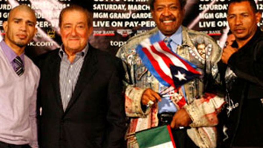 Si la próxima pelea entre Ricardo Mayorga y Miguel Cotto se definiera por la intensidad de la promoción, el púgil nicaragüense noquearía al puertorriqueño en el primer asalto con la ayuda de su promotor, el estrafalario Don King. Fieles a su estilo, Mayorga y King dieron un espectáculo el lunes durante una conferencia de prensa en un hotel de Los Angeles. Cotto habló muy poco y su promotor Bob Arum, contraparte legendaria de King, se mostró complacido por la publicidad generada. Cotto (35-2, 28 nocauts) defenderá ante Mayorga (29-7, 23) su título superwelter de la Asociación Mundial de Boxeo el sábado 12 de marzo en el hotel y casino MGM Grand de Las Vegas. El boricua ganó el cinturón en junio al vencer al campeón Yuri Foreman. "Sólo puedo sonreír, porque Don está vendiendo boletos", dijo Arum luego que King, con su característico cabello vertical, subiera al estrado empuñando banderines y un cigarro para gritar varias veces: "¡Es una guerra, es una guerra!". Fue una presentación de dos legendarios promotores haciendo lo que mejor saben hacer, cada quien a su estilo. Todo, mientras las cámaras rodaban. Vestido con una chaqueta de tela de jeans con lentejuelas y dibujos pintados, King hizo como que exorcizaba a Mayorga porque, según dijo, su púgil está "loco" y tiene múltiples personalidades. "Estamos pidiendo a Dios que le quite todos los demonios que tiene y que le dé claridad para que noquee a Cotto", dijo. "Su único oponente es él mismo. Si puede combatir en unidad con las otras (personalidades), es imbatible". Mayorga, de 37 años, trató de provocar a viva voz a su oponente, sentado tranquilo a su lado. El ex campeón welter del Consejo Mundial de Boxeo levantó varias veces su camiseta con un dibujo de Michael Jackson para mostrar sus abdominales y amenazó con mandar a Cotto de regreso "al club de Ricky Martin". La pelea más recordada de Mayorga en los últimos tiempos fue el combate en peso mediano júnior contra Shane Mosley en septiembre del 2008, cuando el nicaragüense perdió en el último segundo. Cotto, de 31 años, se esforzó para no reaccionar ante las provocaciones. Pero cuando le tocó su turno de hablar, no fue menos que su contrincante. "No puedes enviar a un idiota a decir cosas inteligentes", le dijo a King. Al final de la conferencia, Cotto abandonó la sala, mientras una bandada de reporteros abordaba a Mayorga y King hablaba a los gritos con otros tantos. Arum se quedó hablando con un solitario periodista. "Hay boxeadores que tienen talento para promoción, otros que no. A mí me gusta hacer esto porque mientras más hablo, más me esfuerzo para entrenar y ganar", dijo Mayorga. "En un circo, cada quien hace su show. En el ring, yo hago show porque me gusta". "Al noquear a Cotto", cerró, "voy a poner mi firma de que Don King es el número uno".