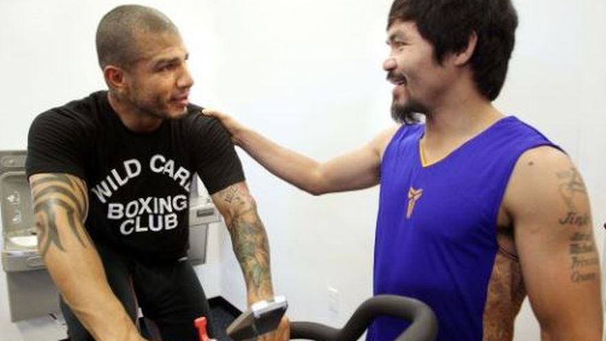 El puertorriqueño Miguel Cotto y el filipino Manny Pacquiao entrenarán juntos en Los Ángeles, California. Así lo reveló el entrenador de ambos púgiles, el estadounidense Freddie Roach. “Durante dos semanas estará trabajando Cotto con Pacquiao. Son buenos amigos, no hay problemas con eso. Haremos una semana en Los Ángeles y la última de Pacquiao en Las Vegas”, comentó Roach. El 12 de abril, el "Pacman" Pacquiao (55-5-2, 38 KOs) se enfrentará al invicto estadounidense Timothy "Desert Storm" Bradley (31-0-0-1 sd, 12 KOs), intentando recuperar el título mundial welter de la Organización Mundial de Boxeo (OMB), en el MGM Grand Garden Arena Las Vegas, en una esperada revancha luego de que el 9 de junio de 2012 el californiano lo destronara del mismo cinturón en fallo dividido en el mismo escenario. En tanto Cotto (38-4, 31 KOs), ex triple campeón mundial en diferentes categorías, intentará transformarse en el primer boricua en consagrarse en cuatro divisiones distintas, cuando se enfrente al argentino Sergio "Maravilla" Martínez (51-2-2, 28 KOs), actual campeón mundial mediano del Consejo Mundial deBoxeo (WBC), el próximo 7 de junio en el Madison Square Garden de Nueva York. Para Roach, no es motivo de preocupación el ascenso de Cotto a dicha categoría. “Nos vamos a concentrar en que Miguel adquiera masa muscular. Sergio es un oponente talentoso y tengo la estrategia perfecta para contrarrestar su velocidad”, explicó. “Miguel tiene total confianza en mí. Definitivamente estaremos listos para lo que traiga Martínez”, finalizó Roach. Foto: Top Rank