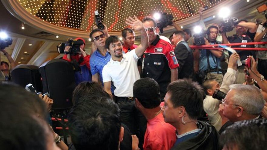 El ocho veces campeón del mundo, Manny “Pacman” Pacquiao ya está en Las Vegas para su esperado combate revancha ante el doble monarca invicto Timothy Bradley que se realizará este sábado 12 de abril en la Arena Grand Garden del Hotel MGM de Las Vegas. “Estoy muy emocionado de regresar a Las Vegas. No peleó aquí desde diciembre del 2012 y ya extrañaba mucho este ambiente”, dijo Pacquiao a su llegada oficial hoy en el MGM en donde hubo mucha gente y un grupo muy grande de prensa. Pacquiao buscará recuperar el campeonato mundial de peso welter de la Organización Mundial de Boxeo (OMB) ante Bradley, quien le arrebató el título mundial al astro filipino en un controversial fallo el 12 de junio del 2012 en el mismo escenario. “La primera pelea ya es parte del pasado. Lo que importa es este sábado y voy a recuperar mi campeonato mundial a como dé lugar”, dijo Pacquiao, quien termino su preparación este lunes en el Wild Card Boxing Club de Hollywood, bajo la tutela de Freddie Roach. Después de sus dos derrotas en el 2012, la única pelea de Pacquiao la realizó en noviembre del 2013 en Macao, China ante Brandon Ríos, a quien derroto fácilmente por decisión unánime. “La pelea en Macao fue una grata experiencia y si la disfrute mucho, pero no hay como una pelea importante en Las Vegas y todo el entusiasmo que hay en esta ciudad”, dijo Pacquiao. El astro filipino reconoce que esta derrota es una pelea muy importante para su carrera, pues aun no ha demostrado totalmente que está de regreso al nivel de antes de sus derrotas. “Esperado darle una gran pelea a mis seguidores y darle una gran satisfacción a todos mis compatriotas filipinos logrado el triunfo este sábado”, dijo Pacquiao. Bradley, llegara por la noche a Las Vegas, después de unas presentaciones promocionales en Los Ángeles, incluyendo una visita al Juego de los Lakers de Los Angeles en el Staples Center. La última conferencia de prensa será hoy a las 12:30 del mediodía en el Hollywood Theater del MGN Grand de Las Vegas.