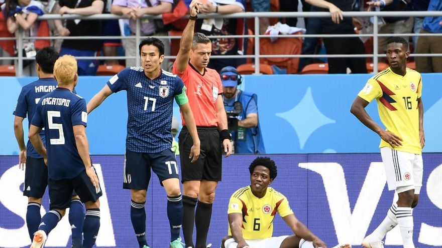El volante Carlos Sánchez es el primer jugador que recibe la tarjeta roja durante el Mundial de Rusia-2018, este martes en el partido entre su selección Colombia y la de Japón.