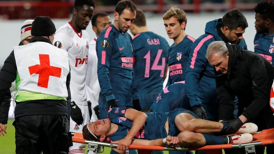 El lateral brasileño sufrió una fuerte patada del portugués del Lokomotiv de Moscú Éder en el minuto 63 del partido de vuelta de octavos de final de la Europa League, que el Atlético ganó 5-1.