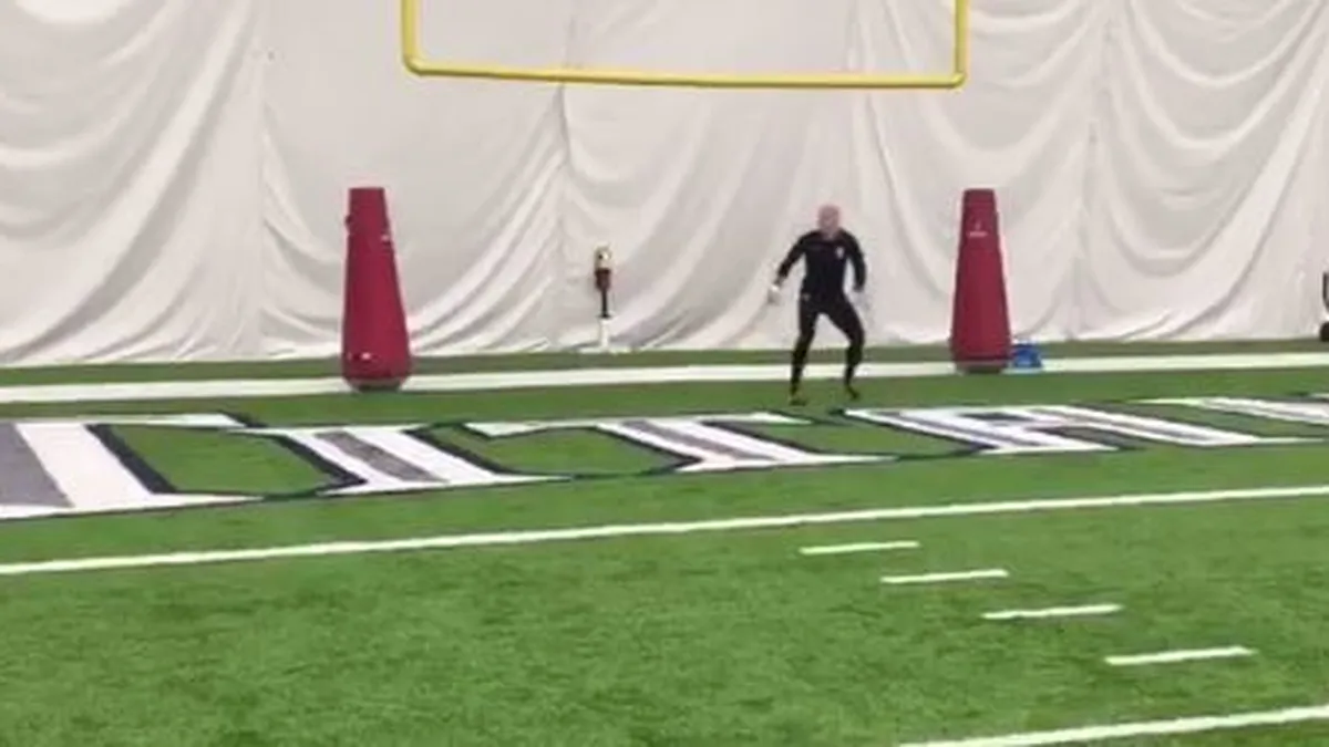 El portero titular de Estados Unidos, Brad Guzan, es visto en un vídeo divulgado hoy por la Federación de Futbol de Estados Unidos (U.S. Soccer por sus siglas en inglés) en medio de dos muñecos de goma mientras es exigido por sus preparadores.
