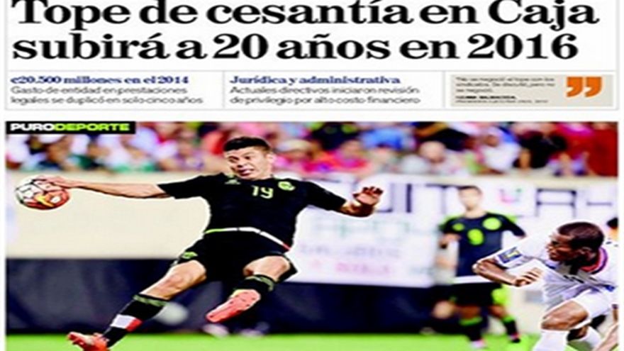 "Selección de Costa Rica fuera por penal regalado a México", destacó el diario La Nación en su portada debajo de la imagen del mexicano Peralta lanzándose por el aire.