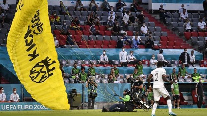Un activista de la asociación ecologista Greenpeace, que sobrevoló el estadio de Múnich en una especie de ultraligero antes del Francia-Alemania de la Eurocopa, estuvo a punto de estrellarse contra las tribunas, constataron los periodistas de la AFP.