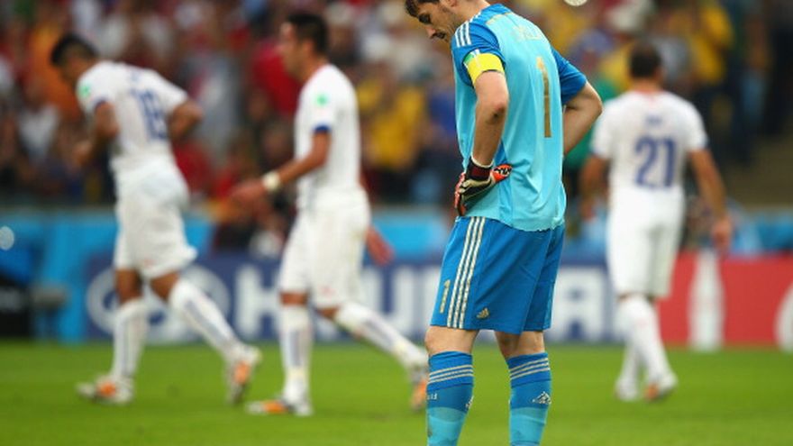 Cayó el rey en Brasil. De la peor manera y sin oponer mucha resistencia, la campeona España quedó fuera de la Copa del Mundo al perder el miércoles 2-0 ante un Chile que avanzó a los octavos de final del torneo. Eduardo Vargas y Charles Aránguiz hicieron los goles chilenos en un primer tiempo de alta tensión para los europeos, lentos en la recuperación e imprecisos en sus pases, pecados capitales para un equipo que vive y muere por el juego de posesión. España encajó siete goles y marcó apenas uno en sus dos primeros partidos, tras la paliza 5-1 que le propinó Holanda en el debut, y con la casilla en blanco ya no tiene opciones de meterse a la siguiente ronda del campeonato. Holanda superó 3-2 a Australia y junto con Chile son los dos clasificados por el Grupo B. Así tal cual, España es apenas el tercer monarca vigente que se despide en primera ronda, siguiendo los pasos de Francia en 2002 e Italia en 2010. Chile y Holanda definen el primer puesto el lunes en Sao Paulo, el mismo día que España enfrenta a Australia por puro trámite y orgullo. Los cambios introducidos por el técnico Vicente del Bosque respecto al equipo aplastado por los holandeses no surtieron el efecto deseado. Xavi Hernández, cerebro y portaestandarte de la mejor generación del fútbol español, quedó en la banca y no vio un solo minuto en cancha, relevado en ataque por Pedro Rodríguez en busca de una variante por la banda. Además, el central Gerard Piqué, de pésimo desempeño ante Holanda, fue reemplazado por Javi Martínez, un polifuncional volante de recuperación que hizo pareja al lado de Sergio Ramos pero no pudo detener la sangría.