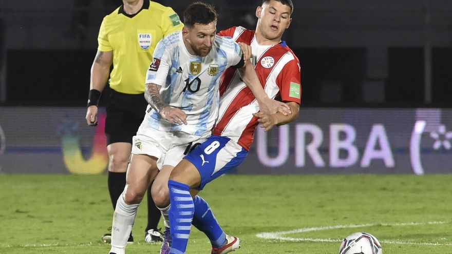 Lionel Messi disputando un balón ante la selección de Paraguay / AFP