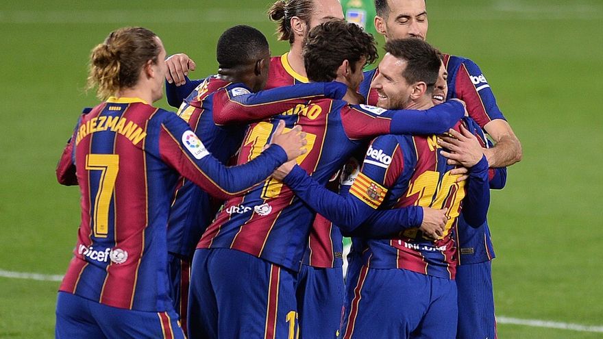 El Barcelona, con 43 puntos, está igualado con el Real Madrid, que el sábado también tuvo que remontar, pero ante el colista Huesca, con doblete del central francés Raphaël Varane.
