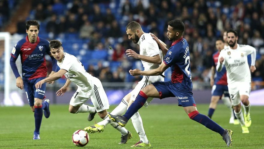 Con el partido en los últimos instantes, fue Benzema el que rompió la igualada con un gran disparo desde dentro del área al palo largo de la portería defendida por Santamaría y completó la remontada del Real Madrid que deja al Huesca a siete puntos de la salvación que marca el Villarreal.