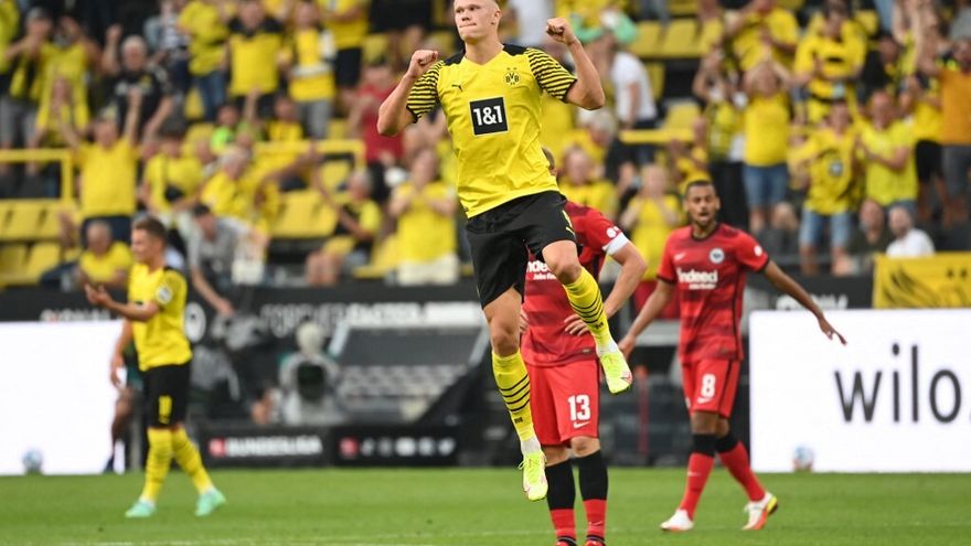 Erling Haaland en Dortmund, temporada 3: liderado por su goleador noruego, autor de dos goles y tres pases de gol, el Borussia barrió 5-2 al Eintracht Fráncfort este sábado en la primera fecha de la Bundesliga y se puso líder de la clasificación junto a Stuttgart y Hoffenheim.