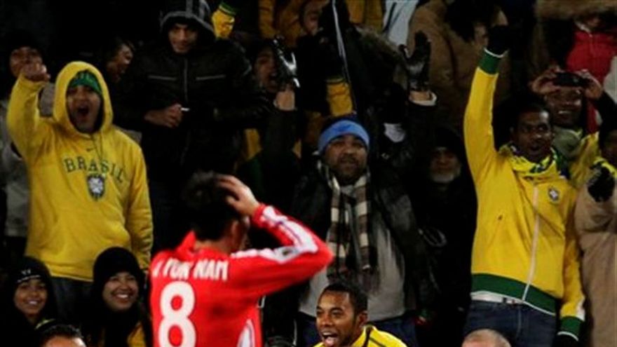 Un gol de Maicon desde un ángulo imposible a los 55 minutos le abrió a Brasil las puertas a una victoria por 2-1 sobre Corea del Norte en su debut en la Copa Mundial, en un partido que dejó muchas dudas acerca del potencial de los sudamericanos. Maicon anotó con un remate casi desde la raya de fondo, que sorprendió al arquero, quien esperaba un pase atrás. Elano aumentó a las 72 al recibir un pase magistral de Robinho, el mejor jugador de Brasil, y Ji Yun Nam descontó a los 89. Los brasileños quedaron así como únicos líderes del Grupo F, en el que previamente Portugal y Costa de Marfil habían empatado sin goles. El tanto de Maicon luego de casi una hora de juego dio tranquilidad a una selección brasileña que mostró pocas ideas, en la que Kaká pasó casi inadvertido. Los norcoreanos, que juegan su segundo mundial y el primero en 44 años, se las ingeniaron para rechazar los tímidos ataques de los brasileños, que se mostraron muy cautelosos en una noche helada, con tres grados centígrados (37 Farenheit). Maicon subió poco, pero cuando lo hizo, marcó la diferencia. En su primera incursión ofensiva seria, remató al arco y el portero Ri Myong Guk desvió al córner en el primer tiempo. En la segunda, llegó a la raya de fondo, amagó tirar un centro atrás y sacó un cañonazo que se coló entre el poste y el arquero, y terminó adentro. Robinho fue el brasileño más incisivo, con algún chispazo de lujo y varios tiros al arco desde media distancia, que fueron la principal arma de Brasil. Michel Basto motivó una lucida atajada de Guk con los puños un remate desde unos 25 metros y también ejecutó un tiro libre desde el borde del área que salió muy cerca del travesaño. Dunga, quien da prioridad al orden y la disciplina, no hizo cambios en el segundo tiempo a pesar del flojo desempeño del primer período, pero sus jugadores le sacaron las castañas del fuego. La subida de Maicon a los 55 compensó todas las fallas ofensivas y Brasil respiró aliviado cuando Robinho le hizo un pase milimétrico a Elano, quien entrando por la derecha marcó el segundo con un tiro bajo, cruzado. Los asiáticos lanzaron esporádicos contragolpes en los que Jong Tae Se, "el Wayne Rooney coreano", complicó a la zaga brasileña con su velocidad. Tae Se exigió a Julio César con un tiro desde la entrada del área y también tuvo un par de remates desviados. En el complemento los asiáticos casi no atacaron. A cinco minutos del final, sin embargo, Ji Yun Nam sorprendió a la zaga brasileña tras un pase largo y descontó luego de ganarle la espalda a Lucio y Juan.