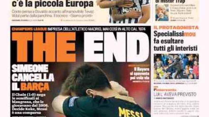 La prensa internacional destaca este jueves la eliminación del Barça en Champions ante el Atlético de Madrid. Una de las portadas más duras es la de "La Gazzetta dello Sport", que titula "The End". El diario italiano destaca en la foto la imagen de desolación de Messi, de quien dice que "fue una comparsa". Por su parte, los medios ingleses resaltan la actuación del centrocampista español del Atlético de Madrid Jorge Resurrección "Koke" por "noquear" al Barcelona, en la vuelta de cuartos de final de "Champions", con un gol que dejó al conjunto azulgrana fuera de la competición europea. El diario "The Times" continúa apuntando que el Atlético "se hizo su propio lugar en la élite" del fútbol a pesar que otros equipos puedan tener "más recursos y pedigrí". El mismo periódico añade que este resultado "podría significar el principio del fin para el técnico azulgrana, Gerardo "Tata" Martino". "The Independent" comenta el duelo del Vicente Calderón apuntando que "el golpe de Koke aturde al Barcelona" y destaca el ambiente del estadio, que "vibró desde el primer minuto al último" en "una de las noches más grandes" del club, en la que se clasificaron para las semifinales de "Champions" por primera vez en 40 años. Según el periódico, el Barcelona tendrá que "romperse la cabeza para tratar de reconstruir su débil defensa", una tarea difícil especialmente después de la sanción de la FIFA por la que no puede fichar jugadores hasta junio de 2015. El diario "The Daily Telegraph" subraya que el Atlético de Madrid, "mortal", comenzó "desenfrenado" y el Barcelona fue "incapaz de responder, asfixiado por la intensidad implacable de sus oponentes". Según este periódico, el conjunto que entrena el argentino Diego Simeone "luchó por cada balón y sudó cada segundo del juego", "igual que en cada uno de sus enfrentamientos con los azulgranas esta temporada". También incide en que la eliminación del club de la ciudad Condal es "un punto negro en la primera temporada de Martino, que bien podría ser la última". "The Guardian" apunta que el Barcelona "se estremecerá" cuando recuerde este partido en el que el triunfo del Atlético de Madrid "no fue por casualidad". El diario británico afirma que el equipo madrileño vive "los mejores días de su vida", a pesar de que son llamados "los perdedores de España" o "los gafes". Texto: EFE/Mundodeportivo.com