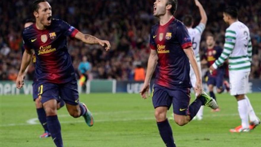 Un gol de Jordi Alba en el último suspiro rescató el martes un partido trabado para el Barcelona en la Liga de Campeones, que ganó por 2-1 al visitante Celtic de Glasgow para seguir perfecto en el Grupo G con tres victorias en igual número de fechas. Alba remató in extremis un centro del brasileño Adriano cuando el empate parecía inapelable gracias a la brillante actuación del arquero escocés, Fraser Forster, a quien arrebató la condición de figura del partido. Porster sí impidió al astro argentino Lionel Messi, pendiente del próximo nacimiento de su hijo, marcar el gol 300 de su carrera profesional, pero no el agónico tanto de Alba ni la victoria 100 del Barsa en la máxima competición continental. Previamente, sólo el visitante Giorgos Samaras, en colaboración infortunada con el argentino Javier Mascherano, y el azulgrana Andrés Iniesta habían acertado a marcar a los 18 y 45 minutos, respectivamente. Pese a su primera derrota, el Celtic conserva la segunda plaza del grupo con cuatro unidades. Tito Vilanova suplió las bajas de los centrales Gerard Piqué y Carles Puyol con el canterano Marc Bartra, zaguero natural llamado a solventar también la falta de altura del once azulgrana frente al poderío aéreo escocés. El Celtic, bien ordenado y sin frivolidades en el mediocampo, apostó su suerte a la inspiración de la dupla atacante formada por Samaras y Gary Hooper, pero bien pronto se llevó un sobresalto con una clara ocasión errada por el chileno Alexis Sánchez quien, solo ante el arquero, cruzó en exceso un servicio de Iniesta. La avanzada presión barcelonista no dejaba salir de la cueva al cuadro de Neil Lennon, e Iniesta, jugando a gusto, puso en bandeja un balón a Bartra, cuyo cabezazo repelió Forster, rápido de reflejos. Del 1-0 a favor se pasó a ventaja visitante en un abrir y cerrar de ojos, cuando Samaras peinó un balón aéreo servido en tiro libre por Charlie Mulgrew, y Mascherano introdujo el esférico en su propio arco. Vilanova venía de denunciar en la previa lo circunstancial de tres tantos en contra anotados en la temporada y, aunque la UEFA otorgó el gol a Samaras, la anotación inclinó considerablemente el partido para los azulgranas. Agarrado a Messi, el Barsa reaccionó con rabia, acelerando la circulación de balón y rozando literalmente el empate en un tiro libre ejecutado por el astro argentino. El Celtic se cobijó retrasando un hombre más, los locales estiraron las bandas con la subida de los laterales, Messi bajó a recibir a la sala de máquinas y Bartra volvió a perdonar de cabeza otro servicio de Iniesta. Mientras los verdiblancos miraban de reojo el reloj esperando el descanso, el Barsa relativizó las urgencias y maduró el partido, consciente de que el más mínimo despiste defensivo le podía condenar. Un zapatazo de Adriano encontró las manos de Forster y el segundo tiro libre de Messi, también cayó en el lado exterior de la red hasta que la gota colmó el vaso. Iniesta frustró la labor del Celtic con el gol del empate al filo del descanso, iniciado en las botas de Messi y finiquitado por la diestra del manchego, ágil definidor en caída tras preciosista pared con Xavi Hernández. Los visitantes no renunciaron a la proeza en una segunda mitad que inició con brío e hicieron valer su superioridad aérea para inquietar al Camp Nou con un cabezazo de Victor Wanyama que se fue fuera por poco. Messi, Iniesta y Xavi permutaron posiciones en el área de creación azulgrana mientras Sánchez interpretó el rol de delantero centro arrastrando a los zagueros. Los espacios generados por el chileno ampliaron el caudal ofensivo del Barsa y solo el brazo de Forster evitó el 2-1 de Messi a centro por derecha de Pedro Rodríguez tras apertura de Sánchez. El arquero visitante creció en protagonismo neutralizando otra llegada de Sánchez y un cabezazo de Messi, nuevamente tras toque de Iniesta, omnipresente repartidor. La fortuna pareció aliarse con el Celtic en el acoso final barcelonista, cuando el poste repelió un latigazo de David Villa en los descuentos. Pero ni Forster ni la madera pudieron frenar el mazazo definitivo de Alba, héroe del partido.
