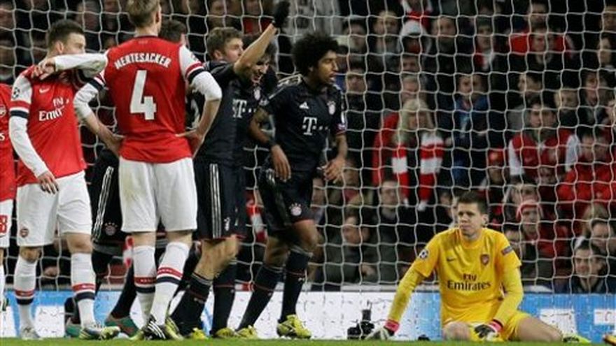 Bayern Munich se floreó ante la inoperancia de Arsenal y quedó con un pie adentro en los cuartos de final de la Liga de Campeones al llevarse el martes una victoria 3-1 en la cancha del equipo inglés. Goles de Toni Kroos y Thomas Mueller en los primeros 21 minutos pusieron en ventaja al equipo alemán, perdedor de dos de las tres últimas finales del campeonato europeo. Mario Mandzukic selló la victoria en el Emirates Stadium al marcar el tercer tanto a los 77. Arsenal amagó una remontada con el gol de Lukas Podolski, ex delantero de Bayern, a los 55. El compromiso de ida por los octavos de final fue marcado por un claro dominio de Bayern, que debió haber ganado con un margen más abultado tras un desigual primer tiempo frente a un Arsenal demasiado frágil en su línea de fondo. Bayern confirmó con creces el excepcional momento que atraviesa, luego del trauma sufrido al perder por penales ante Chelsea en su estadio Allianz Arena en la final de la pasada edición. Los bávaros cabalgan al frente de la Bundesliga, con una ventaja de 15 puntos. Su técnico Jupp Heynckes se vanagloria diciendo que este Bayern es el mejor equipo en la historia del equipo y lo demostró ante unos "Gunners" sumidos en la campaña más floja del ciclo de 17 años del asediado técnico Arsene Wenger. La "Champions" es el último frente de batalla que le queda a Arsenal para romper un ayuno de ocho temporadas sin levantar trofeos. En defensa, Arsenal fue un auténtico colador. Sus centrales Per Mertesacker y Laurent Koscielny no inspiraron la mínima confianza. El primer gol fue culpa de un descuido de ambos al circular el balón frente al área. Tras un mal despeje de Koscielny, Mueller sirvió el centro para que Kroos definiera de volea desde 18 metros. Otro fallo defensivo facilitó el segundo gol. Mueller nada más tuvo que empujar el balón, luego que el portero Wojciech Szczesny había rechazado un cabezazo de Daniel Van Buyten. Con el circuito conformado por Kroos, Javi Martínez y Bastian Schweinsteiger, Bayern fue amo y señor del mediocampo ante un adversario sin ideas e impreciso. Los jugadores de Arsenal no pudieron esconder su fastidio al verse desbordados. Bacary Sagna y Mikel Arteta recibieron tarjetas amarillas por faltas innecesarias. En el costado de la cancha, Wenger se mostraba abatido. Pero el arranque del segundo tiempo le sonrió a Arsenal cuando Podolski capitalizó el mejor momento del local. El delantero alemán se elevó sin oposición para peinar un tiro de esquina ejecutado por Jack Wilshere. Bayern reaccionó y puso cifras definitivas cuando el croata Mandzukic recibió un centro rasante de Philipp Lahm y definió magistralmente ante la salida del arquero. El partido de vuelta se jugará el 13 de marzo.