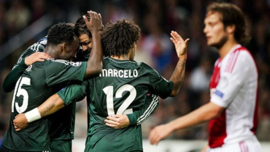El Real Madrid dio un paso en firme hacia los octavos de final de Liga de Campeones, con un triunfo contundente en su visita al Ajax (1-4), en una nueva resurrección de Kaká en plena exhibición de Cristiano Ronaldo de su mejoría física, para marcar un nuevo "triplete". Optó José Mourinho por la opción que menos daño hace al Real Madrid. El pulso con Sergio Ramos le dejaba la responsabilidad de decidir. El castigo de la suplencia perjudica al equipo. El andaluz está instalado por mérito propio entre los mejores centrales del mundo. Así que el técnico portugués apostó por la normalidad en una semana de incendio que se cierra en el clásico del Camp Nou. Ramos fue titular en un once con cinco novedades. El duelo ante el Barcelona está en la cabeza de todos y jugadores como Ángel Di María, Luka Modric y Mesut Özil descansaron de inicio. Se "colaba" en el once Kaká con una nueva resurrección. Verse fuera del Real Madrid le ha abierto los ojos. Su trabajo en silencio le da sus frutos y tras exhibirse en el Trofeo Santiago Bernabéu, tuvo minutos ante el Deportivo y fue titular en Amsterdam. Lo aprovechó Kaká, mejor físicamente que nunca. Estuvo en la creación de las acciones ofensivas de un Real Madrid dueño del partido. El ímpetu del Ajax se frenaba desde la irrupción de Boerrigter a los tres minutos y un centro que no encontró rematador. Cristiano asumió el peso del remate. Lo intentó hasta que marcó. En el "grupo de la muerte" no está permitido el fallo y el conjunto madridista camina firme. La valentía del Ajax y su brillantez técnica se empequeñeció cuando el Real Madrid se adueñó del balón. Cristiano chutaba sin ver puerta, cabeceaba a las manos de Vermeer y el portero se iba ganando protagonismo a base de paradas. Le sacó un potente disparo a Kaká y otro a Marcelo. El Ajax pedía un tiempo muerto a gritos. Hasta parecía aliarse con un hecho inédito, dos balones se pincharon en tan solo tres minutos. El premio a la personalidad madridista llegaría antes del descanso. En una de esas transiciones que tan bien interpretan. Fue Benzema quien explotó su velocidad por el costado izquierdo, dejó un recorte exquisito antes de tener fortuna en un mal centro, que tras rebotar en tres defensas, cayó a Cristiano que solo tuvo que empujarla a la red. Había inventado el primero y asumió el protagonismo en el segundo. Nada más reanudarse el partido, en un contragolpe fugaz, Kaká puso el centro blando a la llegada de Benzema que la rompió con una plástica "tijera". Restaban 42 minutos en los que el Real Madrid podía medir esfuerzos antes del clásico del fútbol español. No supo hacerlo. Se le da mal pasar a un fútbol control con menos verticalidad. Y entre Vermeer, con una mano abajo a un disparo cruzado de Cristiano, y Casillas, resucitaron al Ajax. Un saque de esquina repleto de rosca de Eriksen, encontró la duda del capitán madridista que cuando reaccionó vio como la pelota le pasaba por debajo de las piernas tras cabecear Moisander. Minutos de dudas que pudieron acabar en empate si Hoesen no hubiese rematado a las nubes con todo a su favor un centro de Blind, pero que terminó en goleada cuando Cristiano sacó a relucir su demoledora pegada. Kaká estaba empeñado en firmar una gran noche. Mourinho recurría a Di María porque el partido comenzaba a romperse y los espacios aparecían. Es el escenario perfecto para Cristiano. Benzema y Di María seguían haciendo trabajar al portero del Ajax, que nada pudo hacer ante el disparo ajustado al palo de Ronaldo desde treinta metros. Y menos aún ante el mano a mano, tras pase de Khedira, en el que el portugués picó el esférico a la salida de Vermeer para llevarse un nuevo balón a casa con otro "hat-trick". El Real Madrid camina con firmeza en el "grupo de la muerte", que lidera para evitar sustos. Con incendios fuera del terreno de juego, recupera la estabilidad deportiva. Cuatro triunfos consecutivos son el mejor impulso para afrontar la visita al Camp Nou. Tras la goleada europea, el clásico asoma.