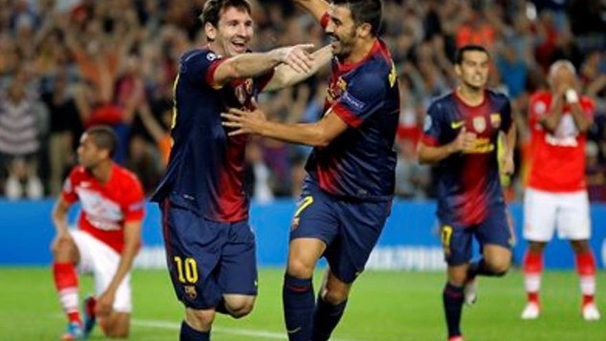 Un doblete de Lionel Messi permitió al Barcelona remontar e imponerse el miércoles 3-2 sobre el Spartak de Moscú en su estreno en esta Liga de Campeones. Un día después que Cristiano Ronaldo marcara en el último minuto para dar la victoria al Real Madrid sobre el Manchester City en un choque muy parecido y con el mismo resultado, Messi anotó a los 71 y 80 para salvar al Barsa de una desventaja de 2-1 frente al conjunto ruso. El Spartak había remontado previamente el tanto inicial de Cristian Tello (14), con un gol en propia portería de Dani Alves (29) y otra diana del brasileño Rómulo (59), pero el astro argentino reaccionó con un doblete que le sitúa en la senda para repetir como máximo cañonero europeo, corona que ostenta desde hace cuatro temporadas. La última derrota europea en casa de los "blaugrana" se remonta a 2009, precisamente ante otro equipo ruso: el Rubin de Kazán. El Spartak salto al terreno sin complejos, pero el Barsa enseguida encontró el compás de Xavi Hernández y destapó una mejorada versión de Tello, pletórico de fuerzas y confianza, a las puertas de una renovación contractual con el club. El primer arrebato local fue un acrobático remate de Gerard Piqué en un tiro de esquina que acabó con el balón en la grada y el central lesionado en el pie izquierdo. Un contratiempo a tener en cuenta de cara al clásico contra el Madrid el 7 de octubre, una vez confirmada la baja del capitán Carles Puyol. Alex Song fue el recambio elegido por Tito Vilanova para formar junto al argentino Javier Mascherano en la retaguardia, y los delanteros visitantes explotaron la pareja de mediocampistas reconvertidos en centrales. Pero antes tuvo tiempo de cobrar ventaja el Barsa, nuevamente mediante el magistral manejo de los tiempos de Xavi, quien prolongó a un toque un pase de Cesc Fábregas hacia la incorporación por izquierda de Tello, inspirado en el recorte y remate combado de diestras, envenenado por el bote, imposible para la estirada de Andriy Dykan. El 1-0 pareció intimidar al Spartak, que dio un paso atrás y juntó líneas en torno a la figura de Messi. Pero fue el propio Barsa el que se encargó de reabrir el cotejo con una sucesión de errores que significaron el empate. El gol inició en un balón en largo a Emenike. El nigeriano ganó en la carrera a Mascherano y centró buscando la bota de Ari pero, tras error en el despeje de Song, encontró la de Alves, quien tropezó con el balón y lo empujó a su propia portería. El Barsa intentó arreglar el estropicio por vía aérea, con sendos cabezazos de Sergio Busquets y Fábregas, este último salvado por la yema de los dedos de Dykan, tras otro caramelo repartido por Xavi. Messi buscó una mayor participación en la segunda mitad, bajando a recibir el balón a la línea de tres cuartos para organizar el ataque estático. El Spartak, mejor asentado sobre la cancha, rozó el segundo en un cañonazo de McGeady y buscó un contragolpe definitorio, circunstancia que empujó al Barsa a buscar soluciones ofensivas, en perjuicio de la alerta defensiva. La jugada del 2-1 vino a escenificar el cariz de ruleta rusa que había tomado el encuentro pues, de no haber repelido Dykan la volea previa de Messi, hubieran sido los azulgrana los que hubieran cobrado ventaja. En cambio el rechace inició el contragolpe mortal que finalizó con toque del brasileño Rómulo, tanto en la superación de Adriano como el disparo frente a Víctor Valdés. Ante la impaciencia del público, el Barsa maduró el partido y encontró nuevamente solución en Tello, quién dribló a McGeady en el área para, desde la línea de fondo, servir a Messi en el empate. Restando un cuarto de hora, David Villa sustituyó a Tello, pero fue la diestra del chileno Alexis Sánchez, ingresado de suplente, la que apareció en el momento justo para asistir a Messi en el gol de la victoria, un certero cabezazo entre dos defensas que alarga la leyenda del argentino.