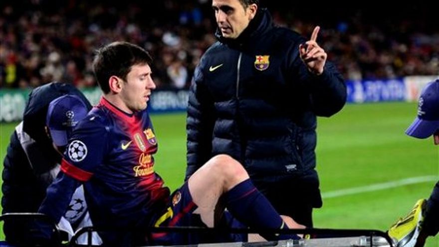 Lionel Messi no empató el récord de goles de Gerd Mueller y en cambio salió en camilla el miércoles del partido entre el Barcelona y en Benfica por la fase de grupos de la Liga de Campeones. El astro argentino, que necesita un gol para empatar el récord de Mueller de 85 dianas en un año natural, comenzó el encuentro en al banca del Barsa y entró a la cancha a los 58 minutos. Messi se lastimó la rodilla izquierda a los 79 minutos, cuando recibió un pase con ventaja y encaró al arquero del Benfica, Artur, quien se le tiró encima de la pierna. A pesar del golpe, el ariete se mantuvo de pie, siguió unos metros y alcanzó a rematar al arco, aunque el guardameta ya se había parado y atajó sin problemas. El árbitro no pitó falta en la jugada. Inmediatamente después de rematar, Messi se tiró al suelo e hizo gestos de dolor, y después de ser atendido unos minutos fue sacado en camilla. "La Pulga" ahora tiene cuatro partidos en 2012 —tres por liga y uno por la Copa del Rey— para igualar y romper la marca que Mueller fijó en 1972.