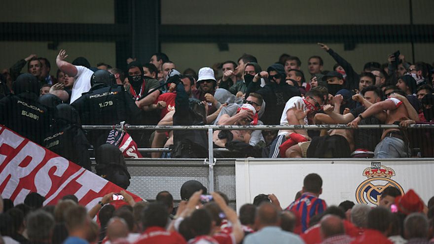 La policía española cargó este martes contra algunos aficionados del Bayern de Múnich, en el descanso del partido de vuelta de los cuartos de final de la Liga de Campeones contra el Real Madrid en el estadio Santiago Bernabéu.