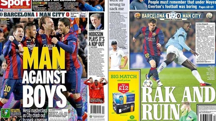 La prensa inglesa hizo eco este jueves del partido que enfrentó al Barça y al Manchester City en la vuelta de los octavos de final de la Champions League. El Barça venció 1-2 en la ida en el Etihad Stadium y volvió a ganar por 1-0 en el Camp Nou. Sin embargo, más allá de los resultados, la eliminatoria destacó por el juego del conjunto blaugrana y por el gran nivel de Leo Messi. Así lo relató la prensa británica.