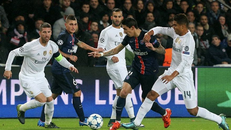 El primer tiempo fue blanco, con claro dominio madridista del balón y del juego. El portero Trapp fue el principal protagonista del equipo parisino, pues detuvo todas las ocasiones claras que el Madrid tuvo.