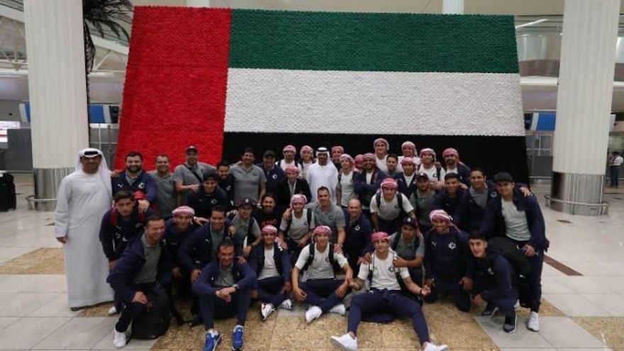 Los integrantes de Chivas pudieron posar en ese aeropuerto con una gran bandera de Emiratos Árabes Unidos y lucieron en la misma gutras, los tradicionales pañuelos emiratíes para la cabeza, a cuadros rojos y blancos.