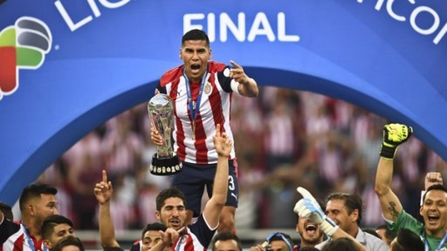 Carlos Salcido, de Chivas, levanta la copa de campeón del fútbol mexicano.