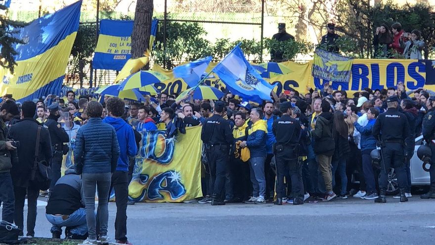Cientos de aficionados del Boca Juniors se reunieron a las puertas del hotel Eurostars Suites Mirasierra, lugar de estancia de su equipo en Madrid con miras a la final de la Copa Libertadores ante el River Plate, para celebrar el tradicional 'banderazo'.