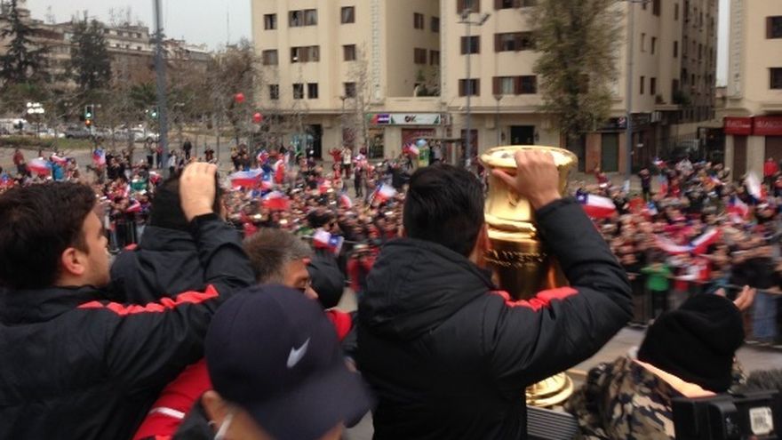 Sobre un bus sin techo, Bravo con la Copa Centenario en mano y junto a otros jugadores iniciaron el andar de varios kilómetros arropados por decenas de miles de chilenos que colmaron varios tramos del recorrido.