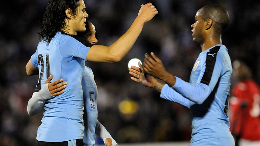 Dos goles del artillero del París Saint-Germain, Edinson Cavani (a los 26, de penal, y 39) y uno del volante de la Fiorentina italiana Matías Vecino (a los 61) dieron la victoria a La Celeste frente a los trinitarios, que habían abierto el marcador sorpresivamente por intermedio de Jomal Williams (a los 6).