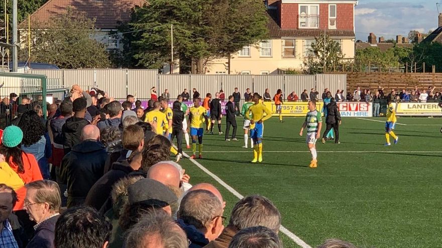 El Yeovil Town ganaba 1-0 en el estadio del Haringey y tenía un penal a favor cuando comenzaron los incidentes, entre hinchas de este equipo, situados detrás de la portería, y el arquero local, Douglas Valery Pajetat.