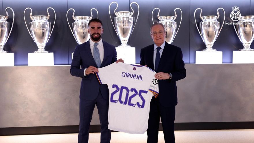"Daniel Carvajal firmó su renovación de contrato en la Ciudad Real Madrid, acompañado por el presidente Florentino Pérez" y "queda vinculado a nuestro club hasta el 30 de junio de 2025", señaló el comunicado del Real Madrid.