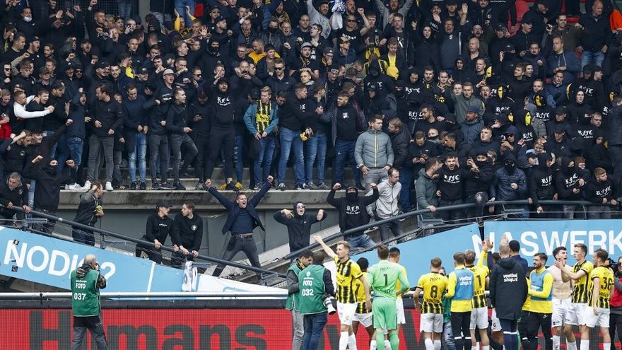 La parte inferior de la tribuna de un fondo del estadio de Nimega se vino abajo cuando unas pocas decenas de aficionados saltaban celebrando la victoria del Vitesse ante los jugadores del equipo, que habían acudido a celebrar ante ellos la victoria en el derbi.