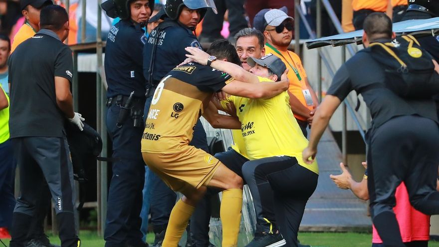 Maradona, que había pasado el juego muy calmado en la banca, estalló en júbilo con el gol y se fundió en un abrazo con el mediocampista mexicano Fernando Arce.