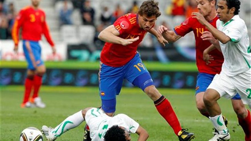 El suplente Fernando Llorente marcó en los descuentos y España sudó la gota gorda para vencer el sábado 3-2 a Arabia Saudita en un fogueo internacional de la "Roja" antes del Mundial. Llorente metió el gol de cabeza después que el portero Walid Abdullah Ali calculó mal su salida en un tiro de esquina. El último tanto evitó a España un resultado adverso en el primero de sus tres últimos encuentros de preparación para el Mundial en Sudáfrica. Con un juego lento y repleto de errores, España cayó abajo 1-0 a los 16 minutos tras un gol de cabeza de Osama Hawsawi. Los campeones de Europa remontaron y se fueron arriba 2-1 con goles de David Villa —su 37mo con la selección— y Xabi Alonso. Unos minutos antes, Sultun Al-Numare estuvo a punto de anotar con un tiro de corta distancia que pasó a un lado del arco. España empezó a imponer sus condiciones después de los primeros 20 minutos y poco después tomó la ventaja por 2-1 de la mano de Villa y Alonso. Sin embargo, el suplente Mohammed Al-Sahlawi empató por Arabia Saudita a los 74 minutos con un remate que se desvió en otro jugador y engañó al portero Iker Casillas. España enfrenta a Corea del Sur el jueves también en Innsbruck en su próximo amistoso. En el Mundial comparte el Grupo H con Suiza, Honduras y Chile. Arabia Saudita no se clasificó al Mundial. ___ Alineaciones: España: Iker Casillas, Sergio Ramos (Carlos Marchena, 61), Gerard Piqué, Carles Puyol (Joan Capdevilla, 61), Alvaro Arbeloa, Sergio Busquets, Xabi Alonso (Javi Martínez, 75), Xavi Hernández, Andrés Iniesta (Jesús Navas, 61), David Silva (Fernando Llorente, 70). Arabia Saudita: Waleed Abdullah, Naif Hazazi (Mohammed Al-Sahlawi, 65), Ahmed Al-Fraidi (Yahea Al-Sheri, 61), Abdullah Shuhail, Osama Hawsawi, Sultan Al-Numare (Ahmed Al-Rhisani, 86), Mishaal Al Saeed (Hasan Khirat, 89), Saud Ali Khariri, Kamil Al Mousa, Abdoh Autef (Asiri, 69), Ahmed Ateef (Abdullah Al-Ghannam, 84).