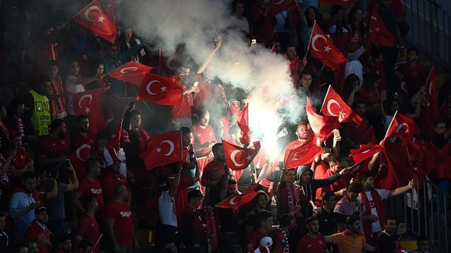 Al menos tres bengalas fueron lanzadas desde las tribunas del estadio por hinchas de Turquía, mientras que otras se encendieron cuando Tufan anotó el segundo tanto a los 65 minutos.