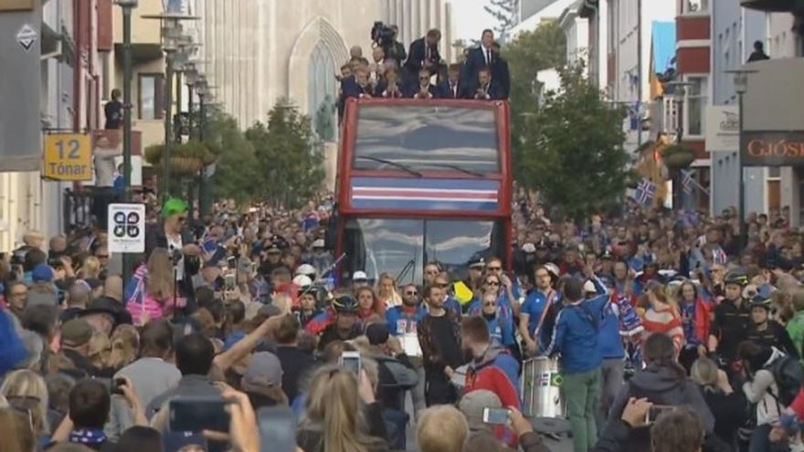 Seguidos por varios miles de personas, los jugadores subieron a un bus descapotable para desplazarse por las calles de la capital hacia el parque Arnaholl, donde se instaló una pantalla gigante para que los islandeses pudieran seguir en directo los últimos encuentros de su selección.