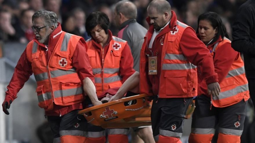 El central internacional francés del Arsenal Laurent Koscielny tuvo que retirarse en camilla este jueves a los diez minutos de partido contra el Atlético de Madrid, en la vuelta de las semifinales de la Europa League.