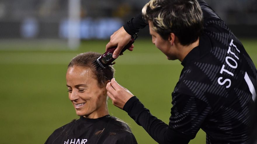 La futbolista de 37 años se sentó sobre una silla ubicada en el Estadio Canberra y, con una capa de barbería sobre su cuerpo, dejó que le cortaran el cabello. ¿Por qué lo hizo?