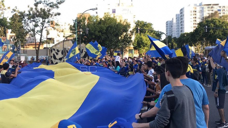 Con cánticos de apoyo y burlas para sus clásicos rivales, la afición 'xeneize' se citó en el Parque Lezama de la capital argentina, próxima a la mítica Bombonera en el barrio de La Boca, para desplegar su pasión por los colores azul y oro.