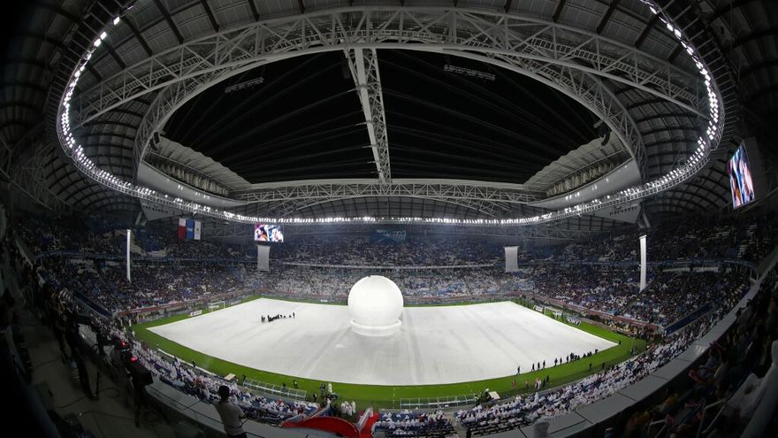 En la ceremonia que precedió al partido, el estadio quedó en penumbra mientras un grupo de artistas efectuaba una actuación alrededor de una perla hinchable iluminada en el centro del terreno de juego.
