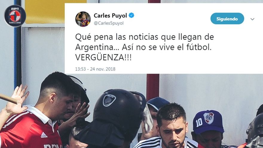 También el ex internacional español Carles Puyol lamentó el episodio. "Qué pena las noticias que llegan de Argentina... Así no se vive el fútbol. ¡Vergüenza!", escribió quien fuera capitán del Barcelona.