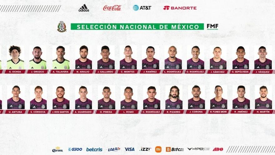-Medios (7): Edson Álvarez (Ajax/Holanda), Sebastián Córdova (América), Jonathan dos Santos (Los Ángeles Galaxy/Estados Unidos), Andrés Guardado (Betis/España), Orbelín Pineda (Cruz Azul), Carlos Rodríguez (Monterrey), Luis Romo (Cruz Azul).