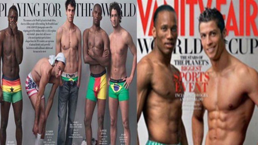 La revista estadounidense "Vanity Fair" se ha propuesto calentar motores antes de que empiece el Mundial de Suráfrica. Algunos jugadores, estrellas de sus selecciones, han posado en calzoncillos para la reconocida fotógrafa Annie Leibovitz. En la portada de la prestigiosa publicación aparecen Cristiano Ronaldo, con la ropa interior de Portugal, y Didier Drogba, con la de Costa de Marfil. En el reportaje, el único futbolista que no posa en paños menores es el madridista Kaká, que luce unos vaqueros algo caídos para que asome la bandera de Brasil. Pato, jugador del Milán, es el encargado de representar a los de Dunga. Completan el reparto Muntari de Ghana, Donovan de Estados Unidos, Eto"o de Camerún, Ballack de Alemania y Stankovic de Serbia.