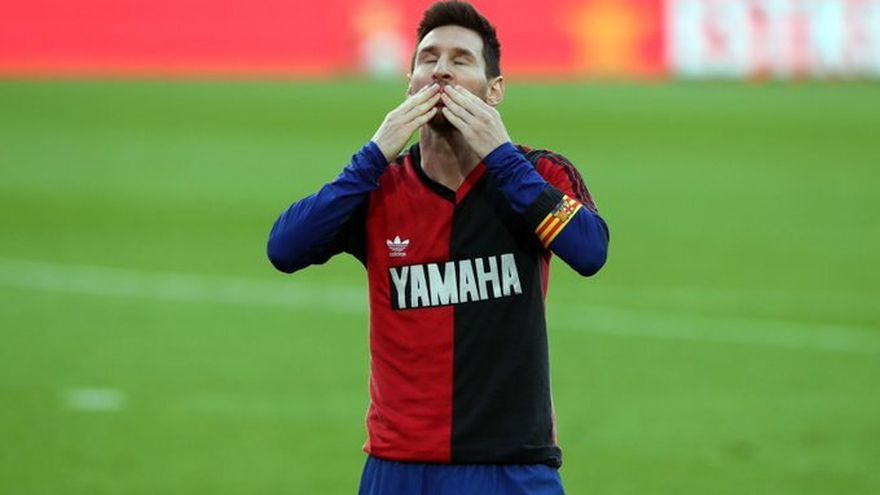 Tras marcar, Messi se levantó la camiseta azulgrana para mostrar la roja y negra con el 10 de Newell's Old Boys, siendo amonestado.