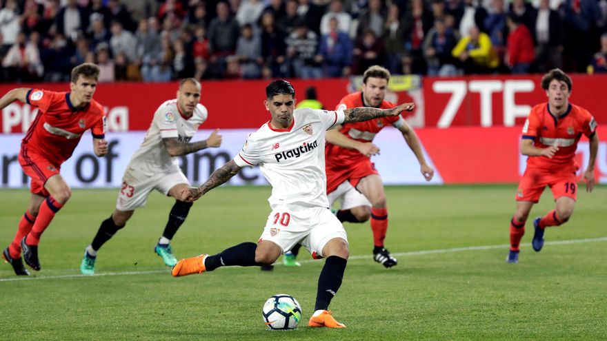 El Sevilla derrotó 1-0 en casa a la Real Sociedad, gracias a un penal transformado por el argentino Ever Banega en el 47, y con ello se puso provisionalmente séptimo, dentro de la zona de Europa League, este viernes tras el partido que abrió la 36ª jornada de la Liga española.