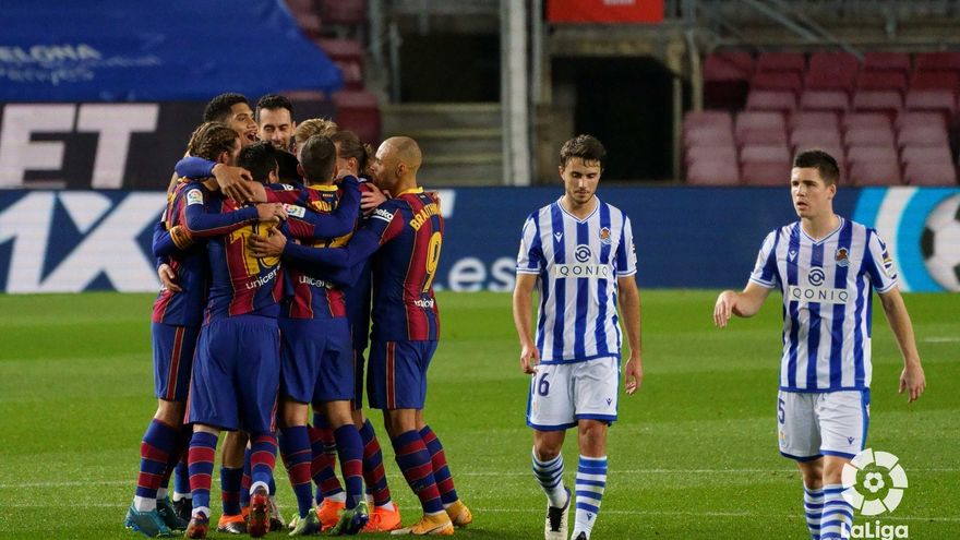 El Barcelona pareció dio un pasito atrás, sin renunciar a atacar aprovechando los huecos dejados por una Real Sociedad lanzada al ataque.