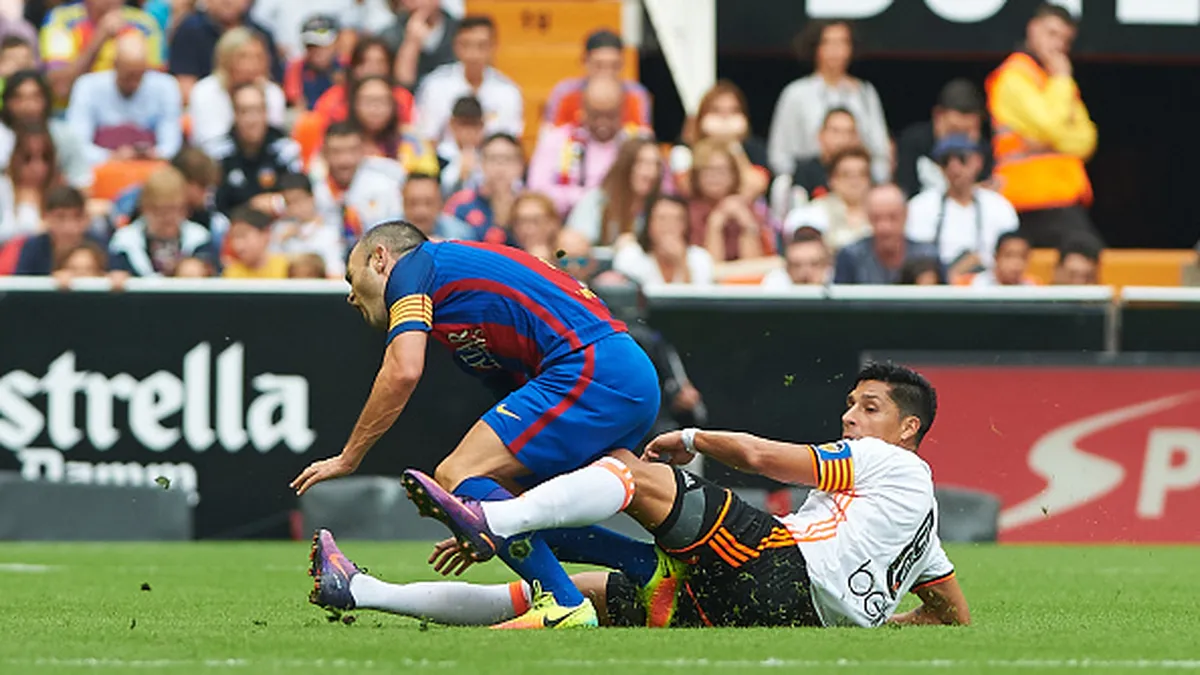 El centrocampista español y capitán del FC Barcelona, Andrés Iniesta, tuvo que ser retirado en camilla este sábado durante el partido de Liga ante el Valencia, dolido de la rodilla derecha luego de una violenta entrada por detrás del argentino Enzo Pérez, y estará de baja "entre seis y ocho semanas".