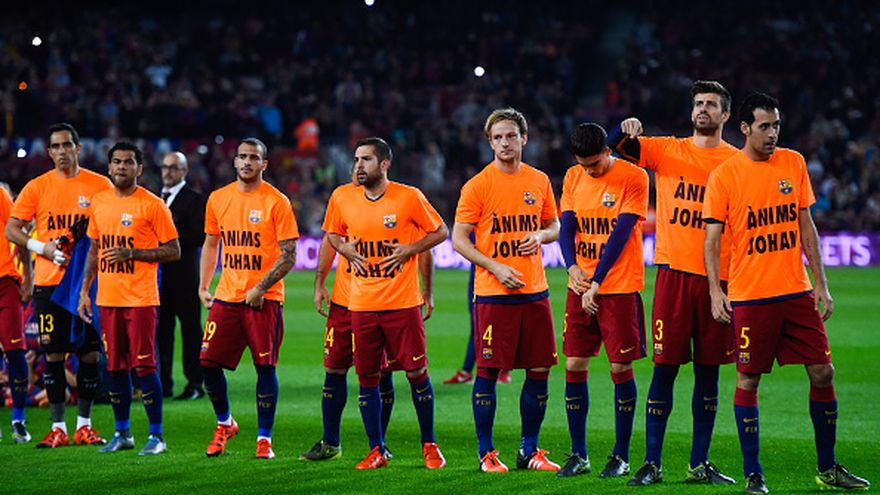 Los jugadores del Barcelona mostraron su apoyo a la leyenda Johan Cruyff, al que se le ha diagnosticado un cáncer de pulmón, saltando al terreno de juego con una camiseta en la que se leía 'Anims Johan' (Ánimo Johan), este domingo ante el Eibar en el Camp Nou.